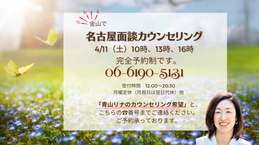 ご予約の際は、「青山リナのカウンセリング希望」とオペレーターにお伝えくださいね。